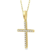 A lovely fashion charms pendant, this offers appeal even in its simplicity. With a cross charm, the pendant holds great attraction for many buyers. The pendant is also enhanced with diamond embellishments to give it an elegant finish. 21 prong set round cut diamonds accentuate the cross pendant, lending it a dazzling shine. The pendant comes on a Rope chain, both of which are styled in rhodium finish 10 karat yellow gold. Total diamond weight is 1/10 ctw.