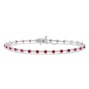 An eye-catching diamond and Ruby precious bracelet, this offers aesthetic and visual appeal, with its colorful layout and design. It features bar-shape links, with a tiny round mount at one end that fits into the next bar link, repeating the process until all the links are connected. While the bars are decorated with 3 each prong hand set round cut diamonds, a total of 84 diamonds, the round mounts are accented with 2.5MM rubies each, 28 in total. An open box closure with push release and additional safety snap lock, secures the diamond and Ruby bracelet, which is styled in 10 karat white gold. Total diamond weight is 1/2 ctw.