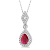 Sophisticated and enchanting, this precious stone pendant offers a royal look to a formal outfit. It features a dangling pear shape mount with a pear cut 6x4 MM Ruby in its center, surrounded by pave set round cut diamonds. The pear shape mount is then attached to a tiny round mount that is decorated by a bezel set round cut diamond. Holding this suspended base is a lattice detail center diamond shape accent, attaching to the included Rope chain. The diamond accent is embellished with another row of pave set round cut diamonds. Both pendant and chain are styled in 10 karat white gold. Total diamond weight is 1/6 ctw.